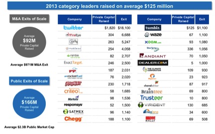 As the chart details, 28 companies reached a $500 million market validation in 2013. The companies that reached the milestone raised, an average (adjusted for outliers like Twitter and Dealer.com) $129 million in private capital. Most of them likely also consumed a few more million in debt. We don’t have data to know how much of the equity raised was primary capital, but the investment requirement pattern is still clear. Admittedly, our $500 million threshold is arbitrary. Shareholder value can be created at a variety of outcomes. However, $500 million represents a reasonable milestone for market recognition of a sustainable company, rather than just an interesting product (cue your Snapchat at $3 Billion comments…).