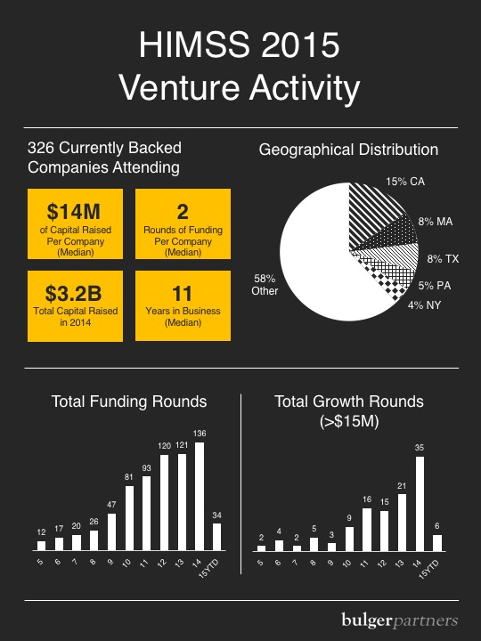 The HIMSS15 venture backed attendees raised a collective $3.2 billion last year, but much of that went to horizontal vendors such as Cloudera raising $900M. 2014’s famed unicorn rounds seem absent in HCIT. Genome database company Human Longevity’s $70 million raise was the largest among the dedicated healthcare IT vendors during 2014’s private bull market.