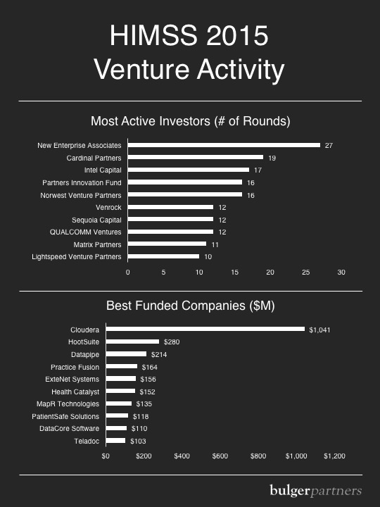 NEA tops the list of HIMSS most active venture investors with 27 current portfolio companies represented at this year’s conference. Corporate venture is prominent across the top investors with Intel, Qualcomm and the Partners Innovation Fund each invested in a dozen or more HIMSS attendees.